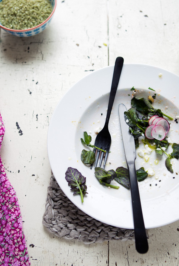 This recipe is an example amongst many of how I like to dress watercress: paper-thin slices of radish and apple, crumbles of feta and black sesame seeds–truly a favorite.
